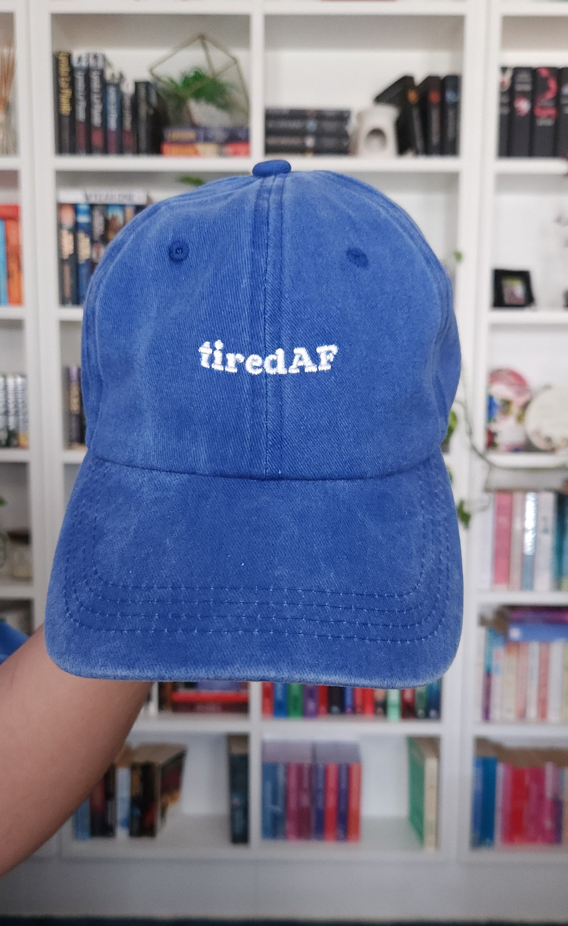 Meet the 'tiredAF' dad cap, a must-have unstructured dad hat designed for mums. Featuring a faded vintage wash and a relaxed fit, this blue cap delivers effortless style and all-day comfort.
